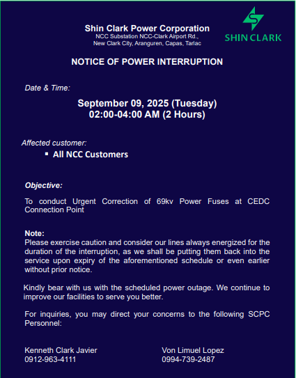 Please be advised that the Energy Regulatory Commission (ERC) has issued a decision dated September 18, 2025 under ERC Case No. 2024-144 RC Approving Shin Clark Power Corporation (SCPC) Initial Distribution, Supply, and Metering Charges and Rate Schedules, and the Appraisal of its Properties, with Prayer for Provisional Authority and/or Interim Relief.