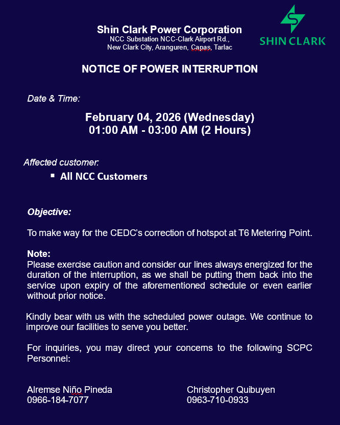 Please be advised that the Energy Regulatory Commission (ERC) has issued a decision dated September 18, 2025 under ERC Case No. 2024-144 RC Approving Shin Clark Power Corporation (SCPC) Initial Distribution, Supply, and Metering Charges and Rate Schedules, and the Appraisal of its Properties, with Prayer for Provisional Authority and/or Interim Relief.